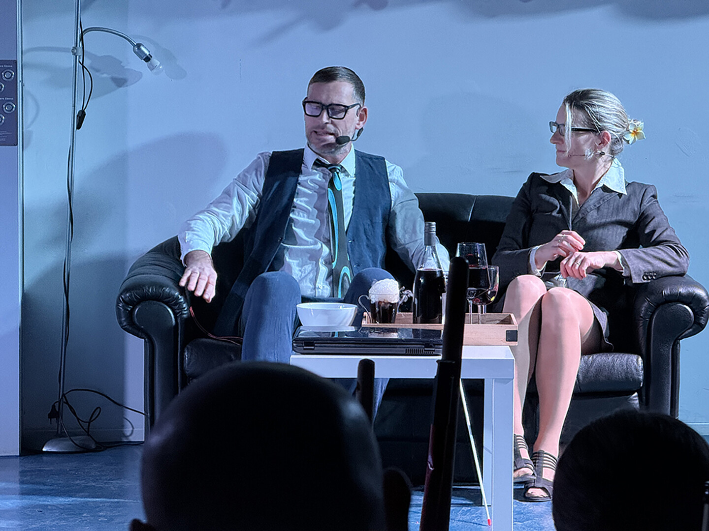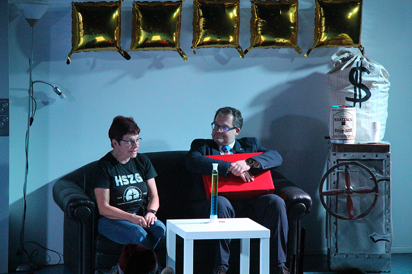 Zwischen den Experimenten spielte das Team humorvolle Szenen rund um die Frage, wie das Rektorat mit der plötzlichen Rückkehr des „berüchtigt-unberechenbaren“ Egon umgeht – inklusive einiger selbstironischer Seitenblicke auf den Hochschulalltag. Knicklichter, Eis, Bier und Menschellimo sorgten für das passende Ambiente. So wurde aus der größten Hochschulbrauerei Zittaus „Ein edles Kratzsch“ serviert. Das von Karin Hollstein und Alexander Kratzsch signierte Fass wurde am Ende der Veranstaltung nach zwei Geboten für 25 Euro versteigert.