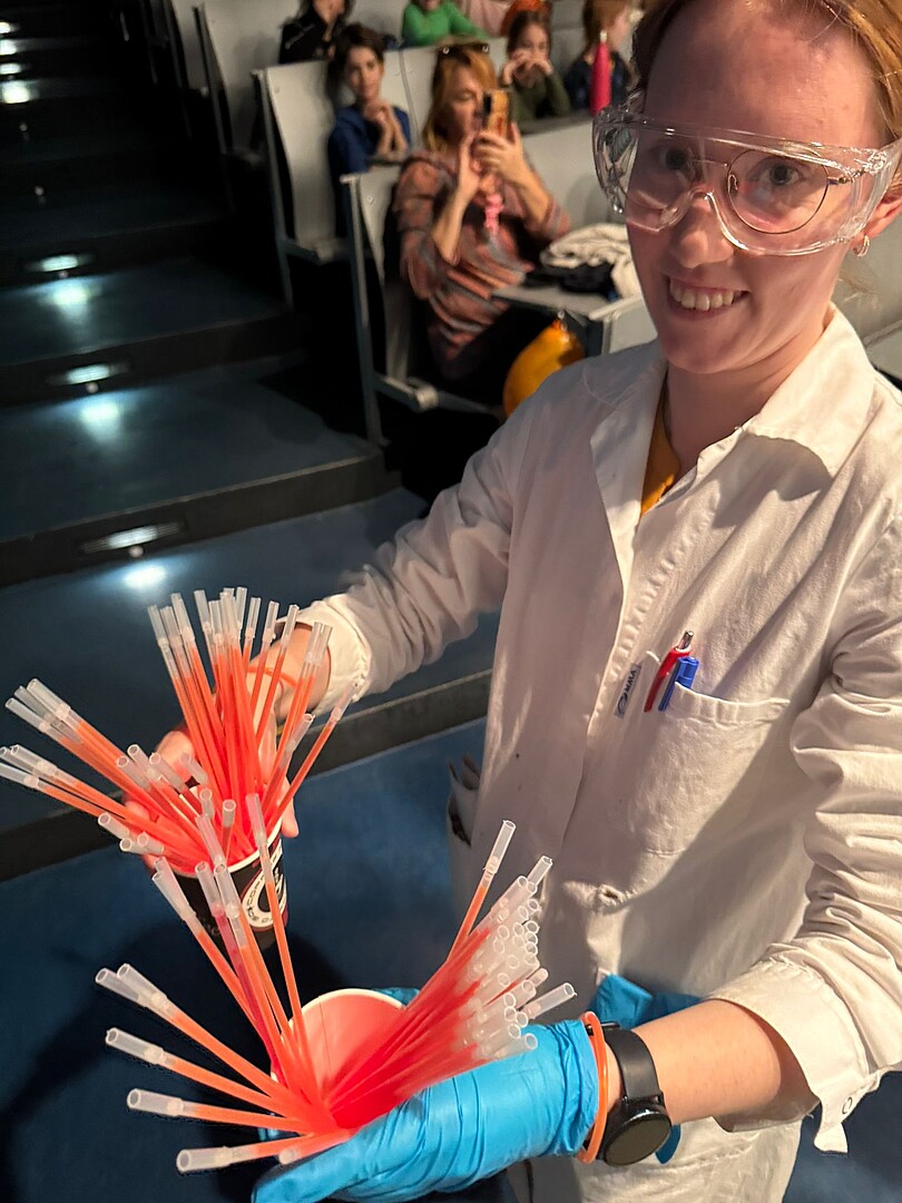 Die Chemieschauvorlesung zeigt jedes Jahr, dass Chemie nicht trocken sein muss – sie kann überraschen, begeistern und richtig Spaß machen. Wenn Feuer, Farben und Schaum über die Bühne fegen, bleibt Eines besonders sichtbar: Wissenschaft lebt von Neugier. Und genau das möchten wir vermitteln.