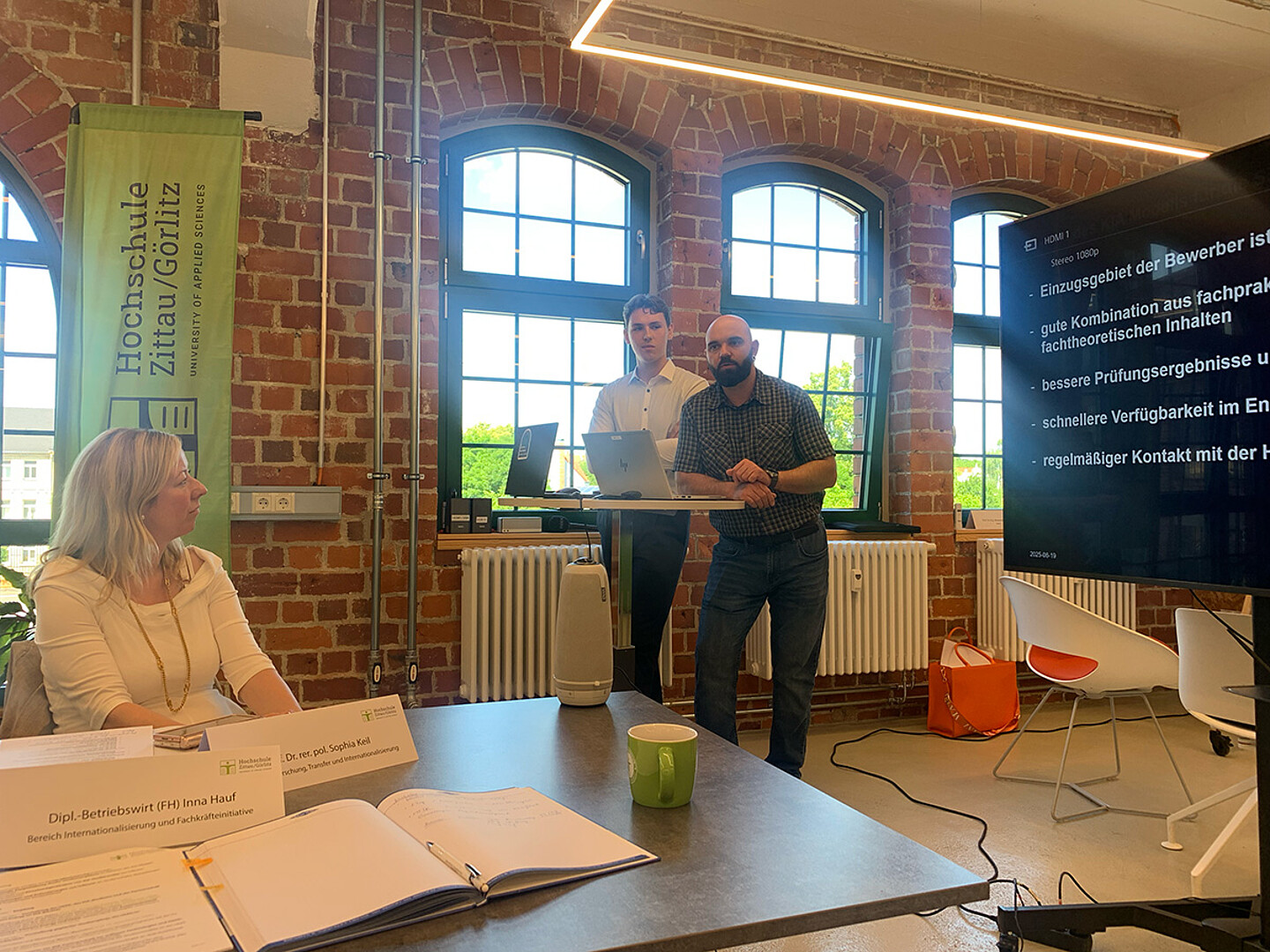 Zu den Gästen des Workshops zählte auch Siemens Energy – ein langjähriger und geschätzter KIA-Partner der HSZG. Janek Tiefel, Lernprozessbegleiter und Ausbildungsleiter von Siemens Energy, sowie der KIA-Studierende Martin Alexander Schlemmer gewährten wertvolle Einblicke in die gelebte Praxis der dualen Ausbildung. Sie berichteten über erfolgreiche Kooperationsmodelle und zeigten auf, wie die Integration von KIA-Studierenden im Unternehmensalltag gelingen kann. Besonders eindrucksvoll schilderte Martin Alexander Schlemmer seine persönlichen Studien- und Praxiserfahrungen und machte deutlich, warum er sich immer wieder für das KIA-Studium an der HSZG entscheiden würde. Die Beiträge von Siemens Energy dienten als praxisnaher Impulsgeber für die anschließende Diskussion mit Infineon.