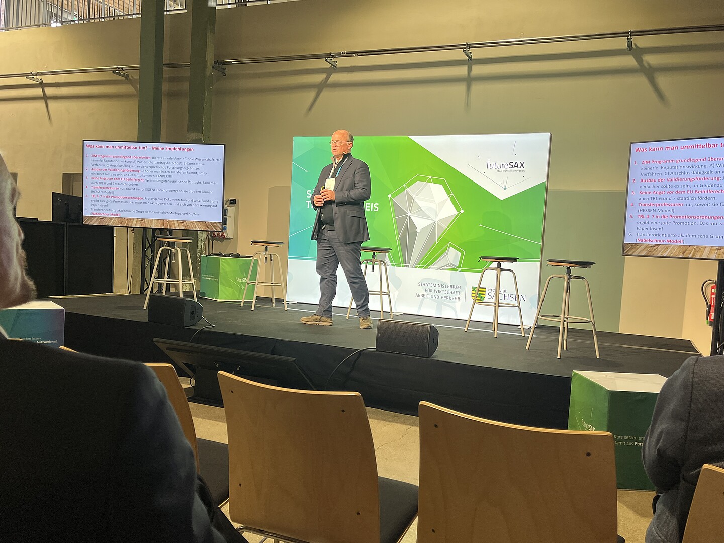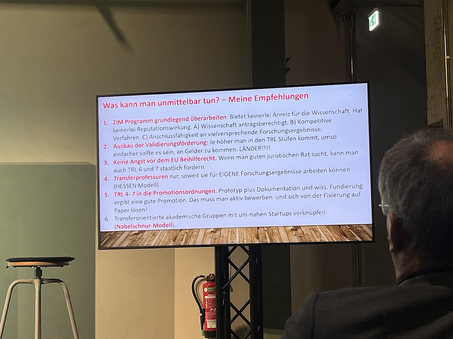 Zu seinen zentralen Empfehlungen gehörten unter anderem verstärkte Anreize für die anwendungsnahe Forschung, eine gleichwertige Anerkennung von Transferleistungen im Rahmen wissenschaftlicher Reputation, ein stärkerer Fokus entsprechender Förderprogramme auf Validierung und Prototyping sowie die Anpassung von Promotionsordnungen und Transferprofessuren zur Einbeziehung praktischer Entwicklungsleistungen. Darüber hinaus betonte er die Notwendigkeit, hochschulnahe Start-ups und Forschungsteams noch enger miteinander zu verknüpfen.