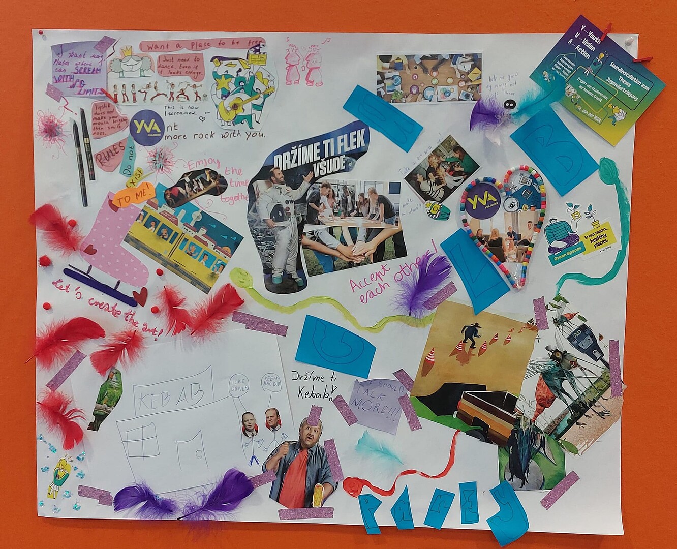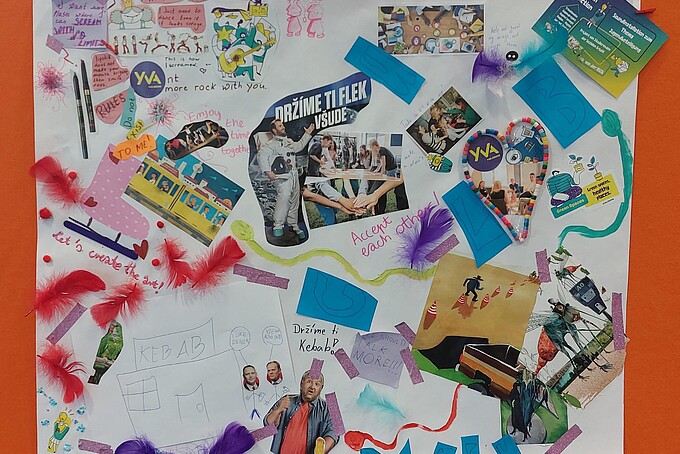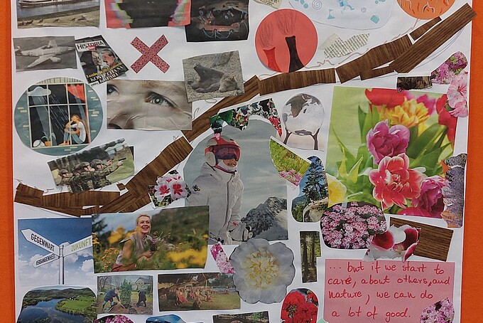 Um die bestehenden Berührungspunkte mit dem regionalen Strukturwandel festzuhalten und um über Interessen, Wünsche und Forderungen in einen ausführlicheren Austausch zu kommen, konnten die Teilnehmenden in einer Gruppenarbeit Collagen anfertigen. Es bildeten sich zwei Gruppen zu verschiedenen Themenschwerpunkten. Eine Gruppe erarbeitete eine Collage, in der sie ihre Ängste und Forderungen zur Zukunft der Region festhielten. Besonders prominent waren die Themen Umweltschutz und Vielfalt. Die andere Gruppe befasste sich in ihrer Collage mit dem Thema Jugendbeteiligung. Hierbei wurde die Forderung nach Aufenthaltsorten außerhalb der Schule und der Familie deutlich. Die Jugendlichen wünschen sich Orte um mit Gleichaltrigen in den Austausch zu kommen und sich kreativ entfalten zu können. Die Ergebnisse wurden stolz präsentiert und regten Gespräche an. Im Anschluss werden sie in der Hochschule ausgehangen.